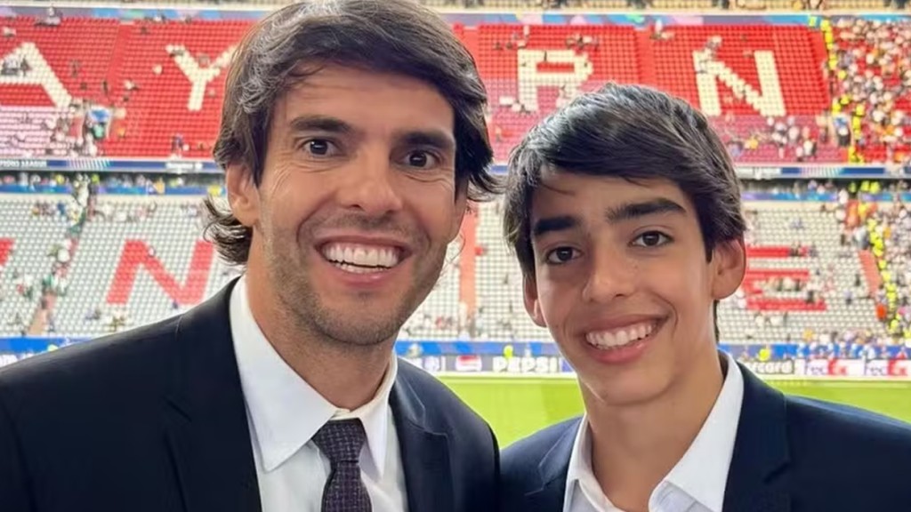 Kaká posou ao lado do filho, Luca Celico Leite, de 16 anos, após a final da Champions League e chamou atenção pela semelhança entre os dois. “Curtindo mais uma final do Champions League! Parabéns para Paris Saint-Germain”, escreveu o veterano ao posar com o jovem na Allianz Arena, na Alemanha.