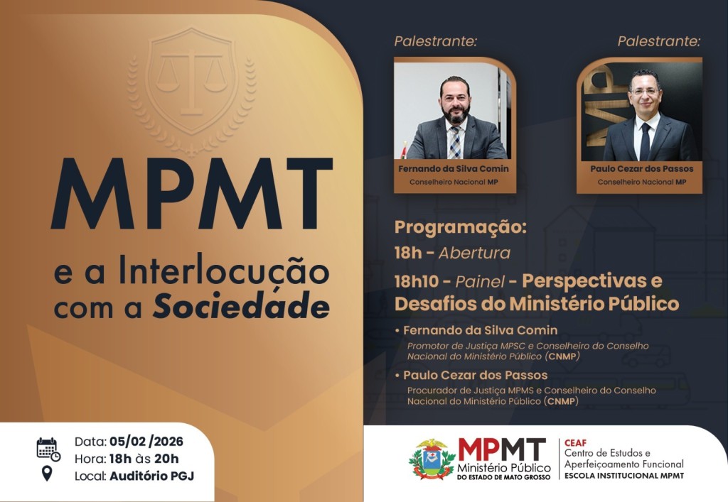 O Ministério Público do Estado de Mato Grosso (MPMT), por meio do Centro de Estudos e Aperfeiçoamento Funcional (Ceaf) – Escola Institucional, realizará nesta quinta-feira (5), o seminário “Ministério Público e a Interlocução com a Sociedade”. O evento será no Auditório da Procuradoria-Geral de Justiça, em Cuiabá, das 18h às 20h, e é destinado aos membros da instituição.A programação contempla a abertura oficial e o painel “Perspectivas e Desafios do Ministério Público”, que contará com a participação dos conselheiros do Conselho Nacional do Ministério Público (CNMP), Fernando da Silva Comin e Paulo Cezar dos Passos. Durante a exposição, os painelistas abordarão o papel institucional do Ministério Público na promoção da cidadania, da transparência e da proteção dos direitos humanos e coletivos. Após as apresentações, haverá espaço para perguntas do público.O objetivo do seminário é fomentar o debate sobre práticas e experiências de interlocução entre o Ministério Público e diversos segmentos sociais, incluindo movimentos, entidades e cidadãos. “A capacitação procurará identificar desafios e oportunidades para aperfeiçoar a comunicação institucional e ampliar a participação social. Além disso, fomentará a troca de saberes entre profissionais, especialistas e sociedade, fortalecendo redes de cooperação”, explica o procurador de Justiça Antonio Sergio Cordeiro Piedade, coordenador do Ceaf. A iniciativa também pretende incentivar o desenvolvimento de ações proativas que ampliem o acesso à informação, fortaleçam a prestação de contas e estimulem o engajamento público nas agendas prioritárias do Ministério Público.
