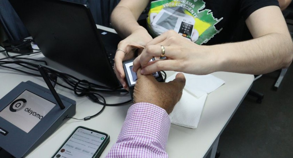 #PraTodosVerem: A imagem mostra o momento do cadastramento biométrico. Uma servidora da Justiça Eleitoral auxilia um eleitor a registrar sua digital em um equipamento próprio, enquanto um computador está conectado ao processo. Na mesa também há um celular e outros dispositivos de apoio.