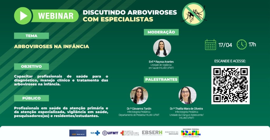 Nesta quinta-feira (17.4), às 17h, será realizado um webinar com o tema Arboviroses na Infância, que poderá ser acessado no YouTube por meio deste link (https://youtube.com/live/7XEQYHV9LQM?feature=share).