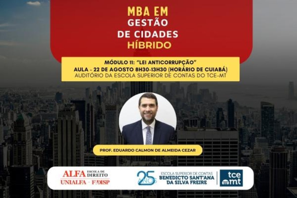 O Tribunal de Contas de Mato Grosso (TCE-MT) realiza o 11º módulo do MBA em Gestão de Cidades, a partir das 8h30 desta sexta-feira (22), no auditório da Escola Superior de Contas. A aula será transmitida ao vivo pelo Canal do TCE-MT no YouTube e pela TV Contas (Canal 30.2).