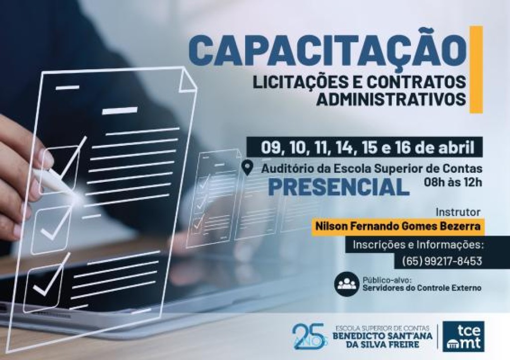 O Tribunal de Contas de Mato Grosso (TCE-MT) promove, de 9 a 16 de abril, capacitação sobre Licitações e Contratos Administrativos. O curso será realizado no auditório Lenine de Campos Póvoas, da Escola Superior de Contas, a partir das 8h. Clique aqui para se inscrever.