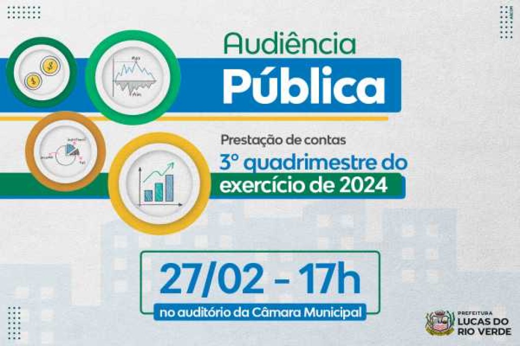 Em conformidade com a Lei de Responsabilidade Fiscal nº 101/2000, a Prefeitura de Lucas do Rio Verde, por meio da Secretaria de Desenvolvimento Econômico, Planejamento e Cidade, realizará uma audiência pública para a prestação de contas do 3º quadrimestre do exercício de 2024. O evento ocorrerá no dia 27 de fevereiro de 2025, no auditório da Câmara de Vereadores, com início às 17h.
