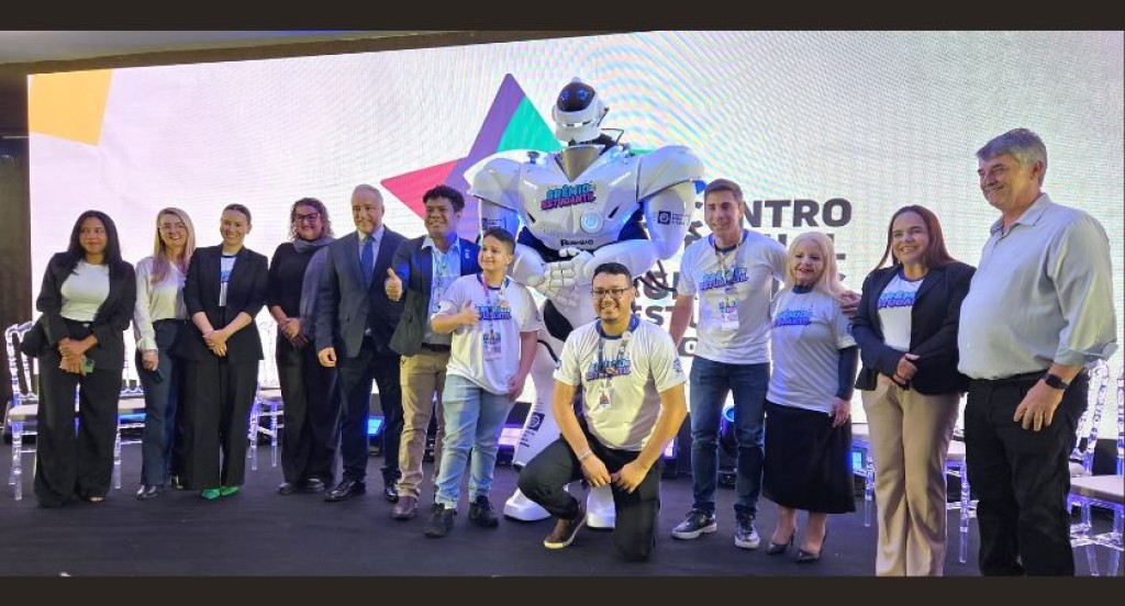 #PraTodosVerem: A imagem principal mostra um grupo de pessoas posando para foto em um palco, durante um evento. Entre os participantes estão homens e mulheres, alguns vestidos formalmente e outros com camisetas personalizadas do encontro. Ao centro, chama a atenção a presença de um robô de grande porte, também com a camiseta do evento, reforçando o caráter inovador e tecnológico da ocasião. Ao fundo, há um painel com elementos gráficos e o nome do encontro parcialmente visível. Ao final da matéria, há uma galeria com mais fotos do evento.