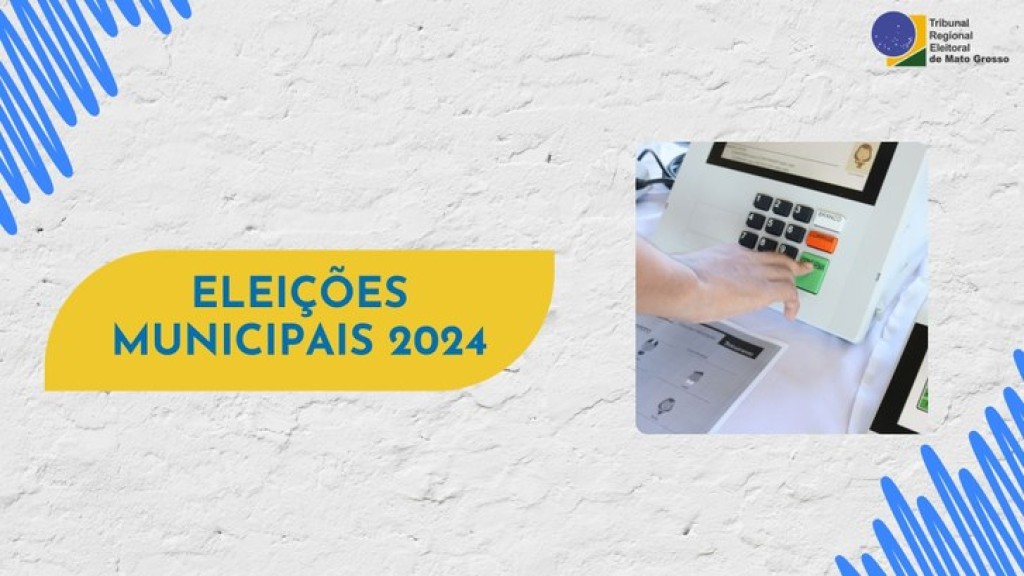#PraTodosVerem: Imagem com fundo em textura branca e, no centro, está escrito ELEIÇÕES MUNICIPAIS 2024, ao lado de uma foto em que aparece uma mão apertando a tecla confirma na urna eletrônica. Nos cantos inferior direito e superior esquerdo tem detalhes de riscos azuis, e no canto superior direito está a marca do TRE-MT.